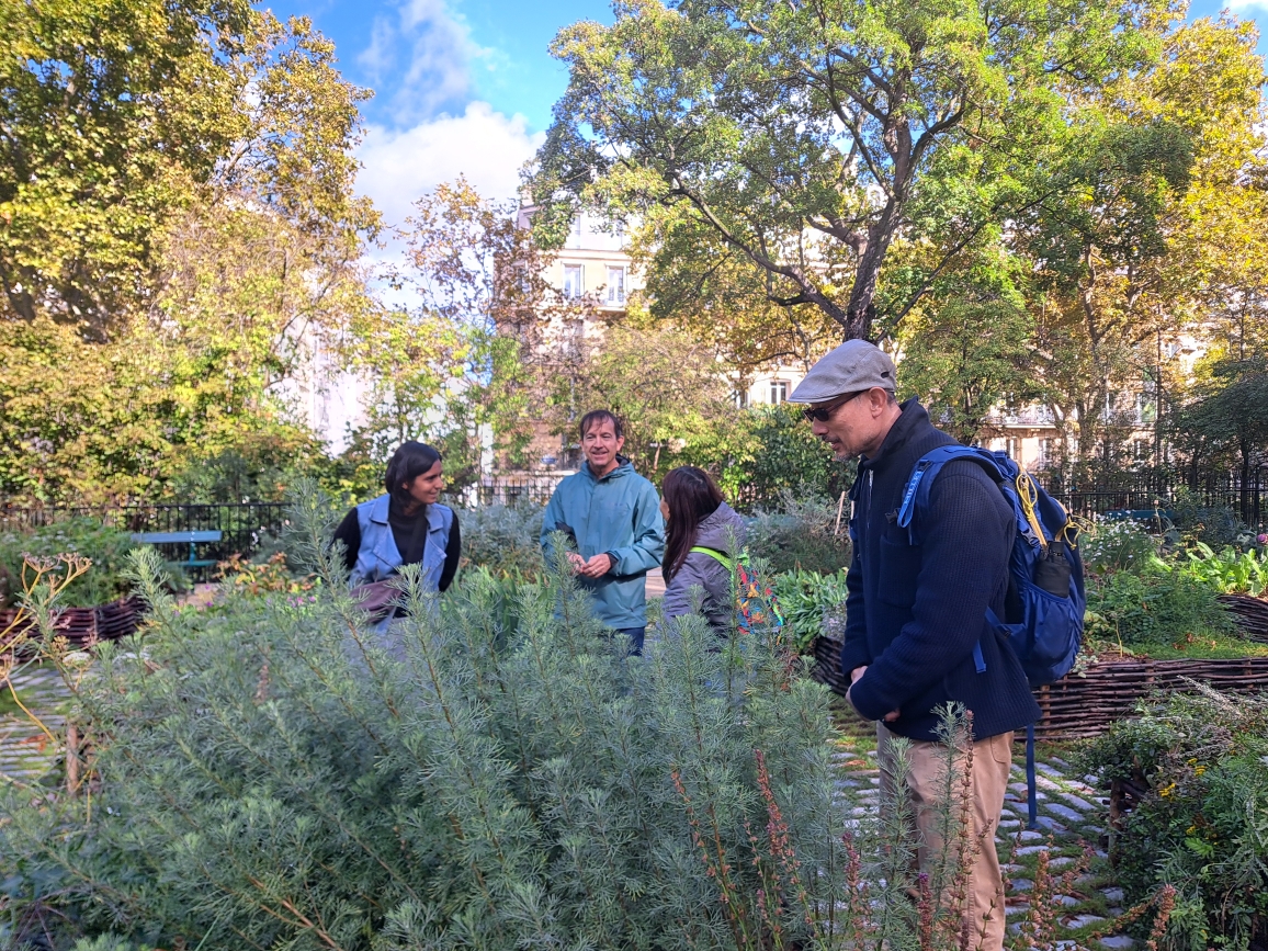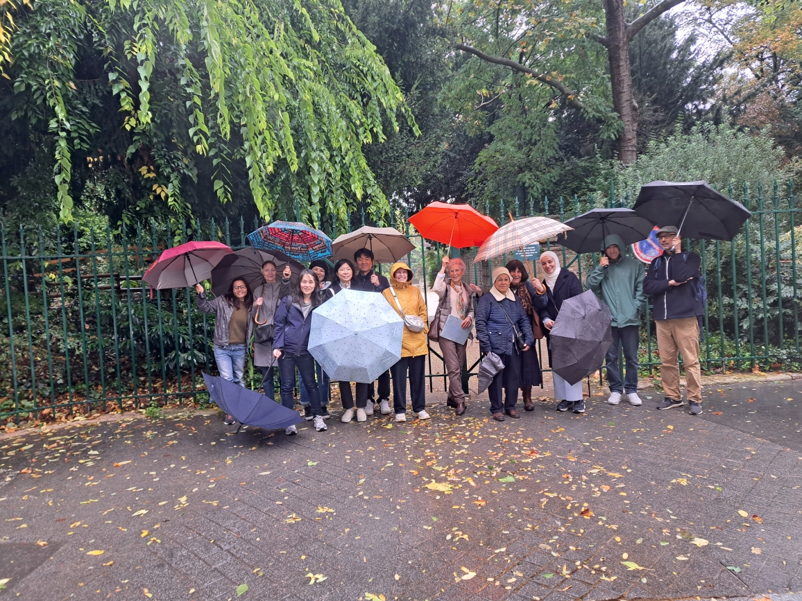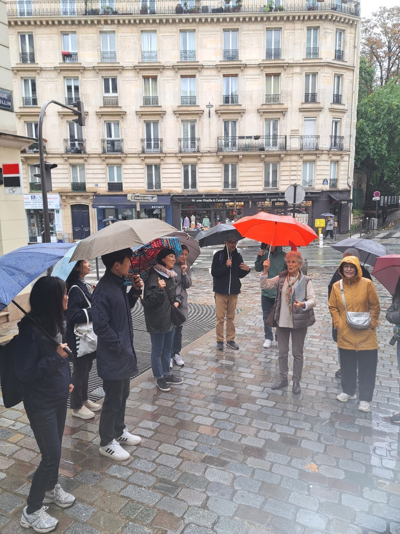 Une douzaine d'étudiants et trois animatrices se sont retrouvés sous une pluie battante au rendez-vous proche des Arènes de Lutèce. Mais la grille d'accès était fermée en raison du vent qui soufflait fort. L'exposé a donc eu lieu devant les arbres centenaires du jardin, chacun à l'abri sous son parapluie.
