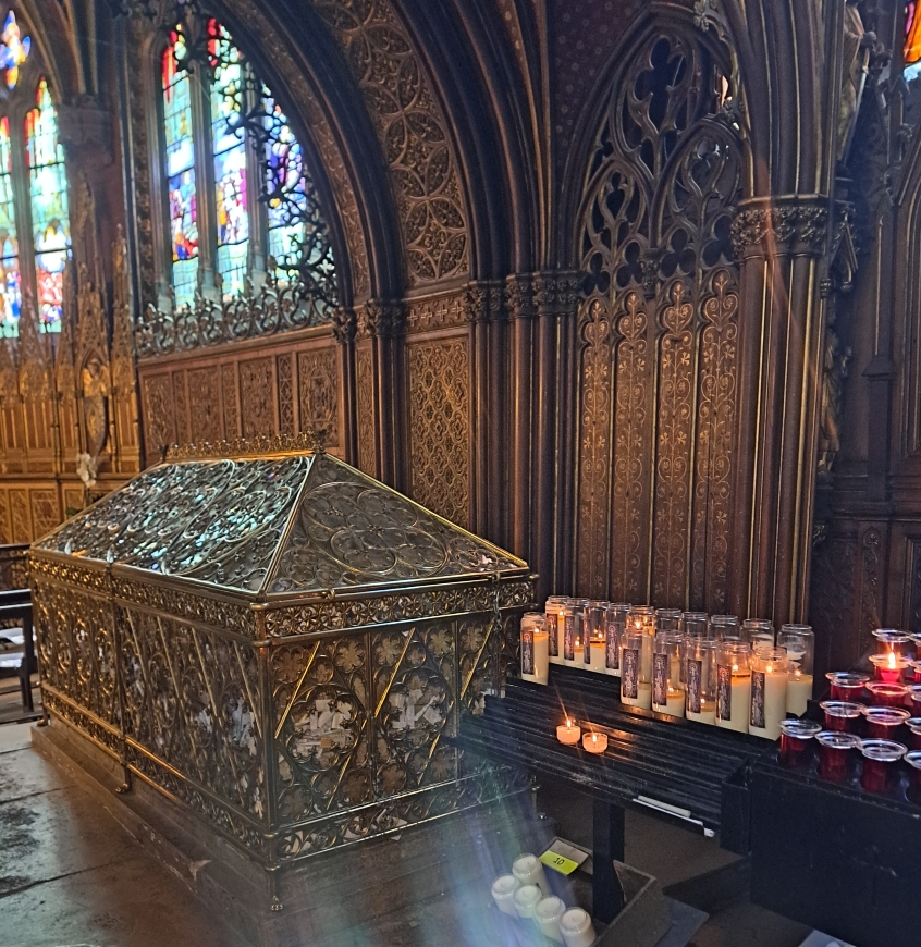 Montagne Sainte Geneviève : qui est cette femme étonnante dont la vie a laissé des traces profondes dans l’imaginaire parisien? Née dans une famille gallo-romaine attachée au service de Rome, elle est douée d’une grande intelligence, parle plusieurs langues, manifeste très tôt une forte personnalité. Devenue religieuse par choix, elle est appelée à éviter la prise de Paris par Attila, puis par les Francs. Considérée comme une sainte par le peuple dont elle prend soin, elle est vénérée après sa mort. Saint Etienne du Mont est l’église qui contient ce qui reste de ses reliques, dispersées par les révolutionnaires au 18e siècle. Cet acte destructeur n’empêche pas la dévotion populaire de continuer, et Geneviève est toujours la patronne chrétienne de Paris ! L’église, construite aux 16 et 17e siècles, garde la châsse de Geneviève. Elle abrite aussi un ornement architectural remarquable, son jubé de marbre, unique en France.