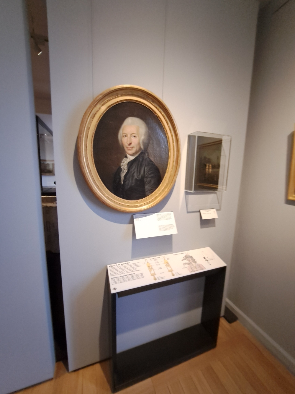 - le portrait de Guillotin créateur de la guillotine et les pendants d'oreilles représentant la lame et les têtes du roi et de la reine,