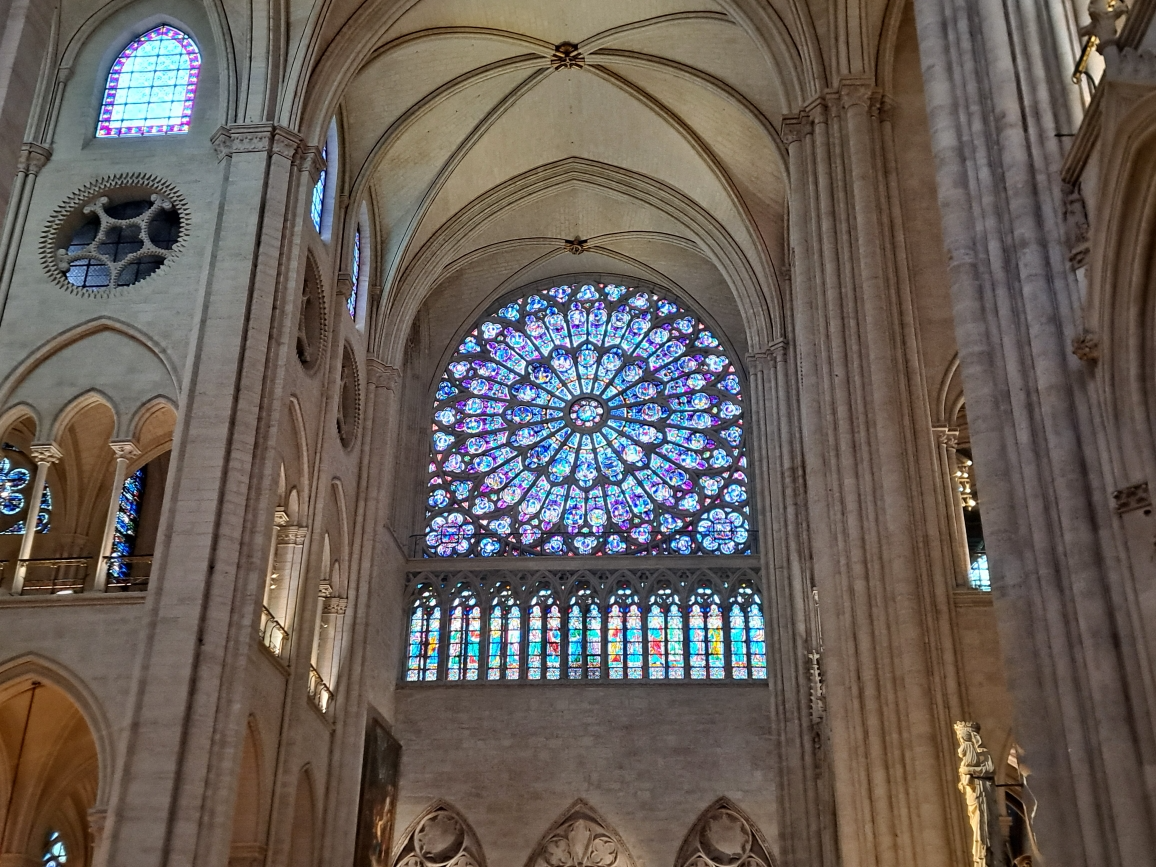 Nous arrivons au transept nord : d’un côté la Rose nord : 13 m de diamètre, reposant sur une arcature de 5 m, soit une verrière de 18 m de hauteur. Le style gothique est alors à son apogée. Trois cercles concentriques de 16, 32, 32 médaillons (multiples de 8, nombre de la vie nouvelle) autour d’une Vierge à l’Enfant, représentant les témoins de l’histoire d’Israël dans l’attente de la venue du Messie.