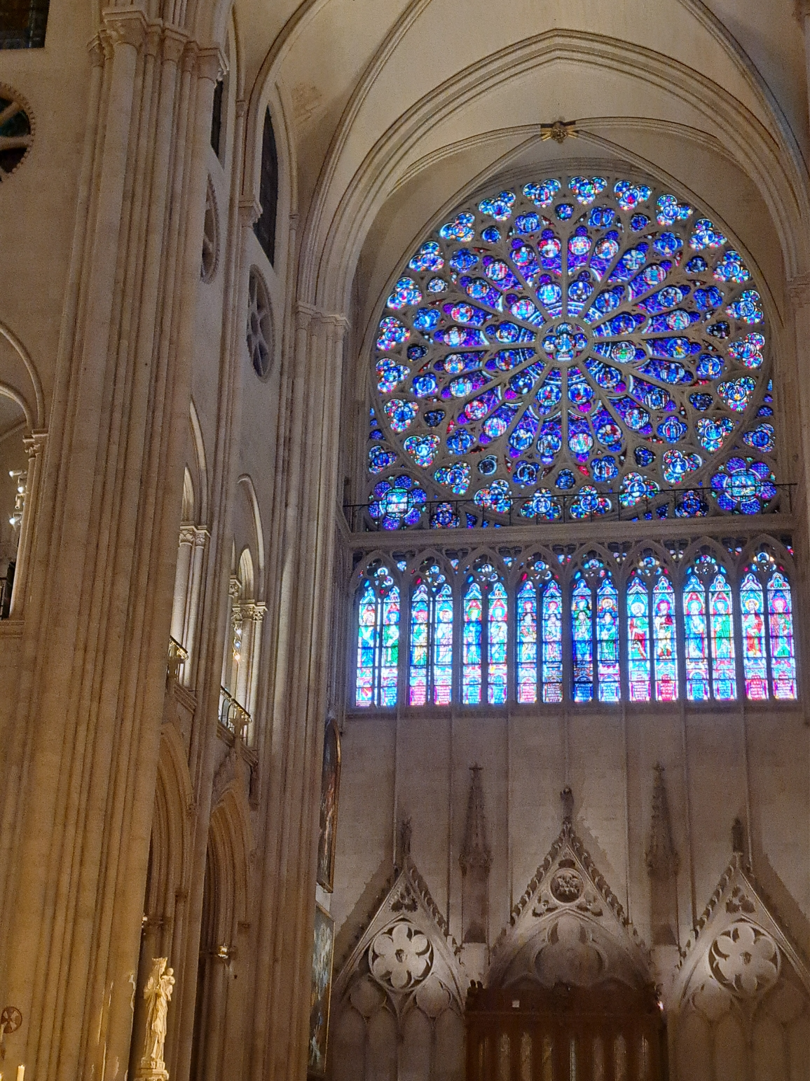 Nous arrivons au transept nord : d’un côté la Rose nord : 13 m de diamètre, reposant sur une arcature de 5 m, soit une verrière de 18 m de hauteur. Le style gothique est alors à son apogée. Trois cercles concentriques de 16, 32, 32 médaillons (multiples de 8, nombre de la vie nouvelle) autour d’une Vierge à l’Enfant, représentant les témoins de l’histoire d’Israël dans l’attente de la venue du Messie.