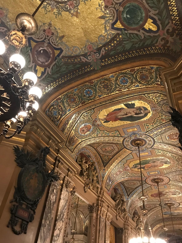 Le Grand Foyer a demandé 8 années de travail à Paul Baudry pour peindre le plafond : on y voit 8 muses (il manque la rhétorique Polymnie !), des représentations de la Comédie, de la Tragédie, de la Musique et de la lyre d’Apollon. Partout de l’or … et le buste de Charles Garnier.