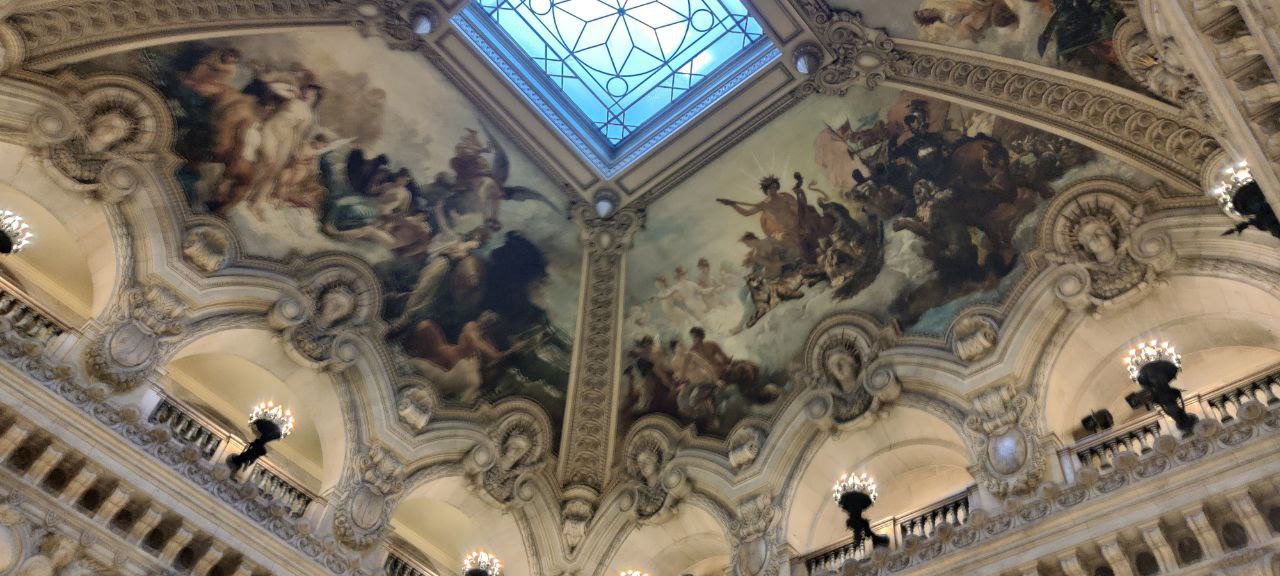 Le plafond en 4 tableaux d’Isidore Pils, célèbre la gloire d’Apollon. 6400 lumières éclairent la salle. Un puits de lumière connecte le monde de rêve au ciel - monde des dieux !