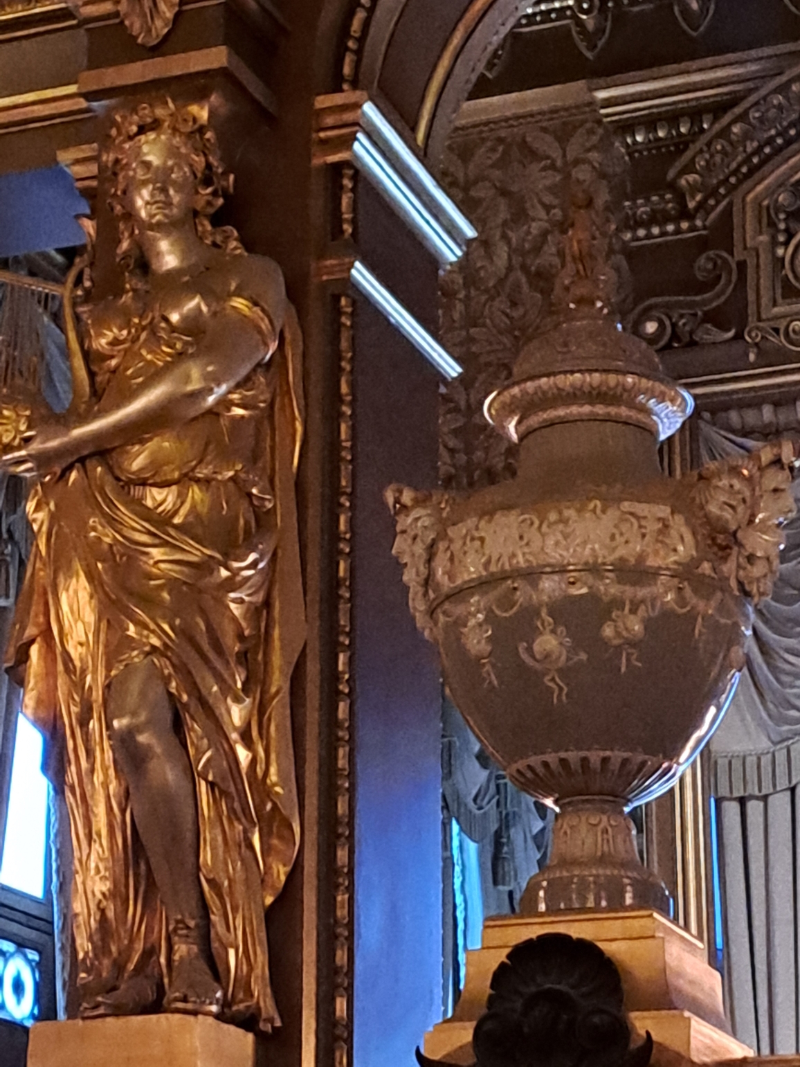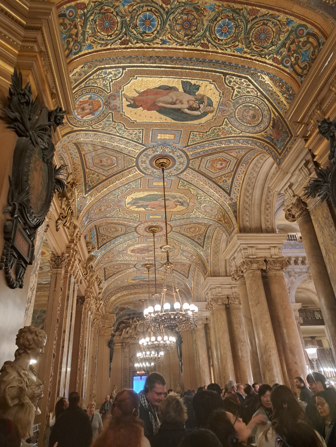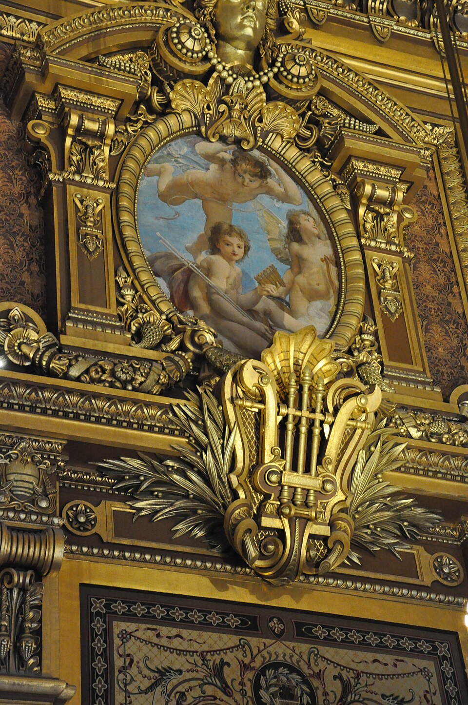 Le Grand Foyer a demandé 8 années de travail à Paul Baudry pour peindre le plafond : on y voit 8 muses (il manque la rhétorique Polymnie !), des représentations de la Comédie, de la Tragédie, de la Musique et de la lyre d’Apollon. Partout de l’or … et le buste de Charles Garnier.