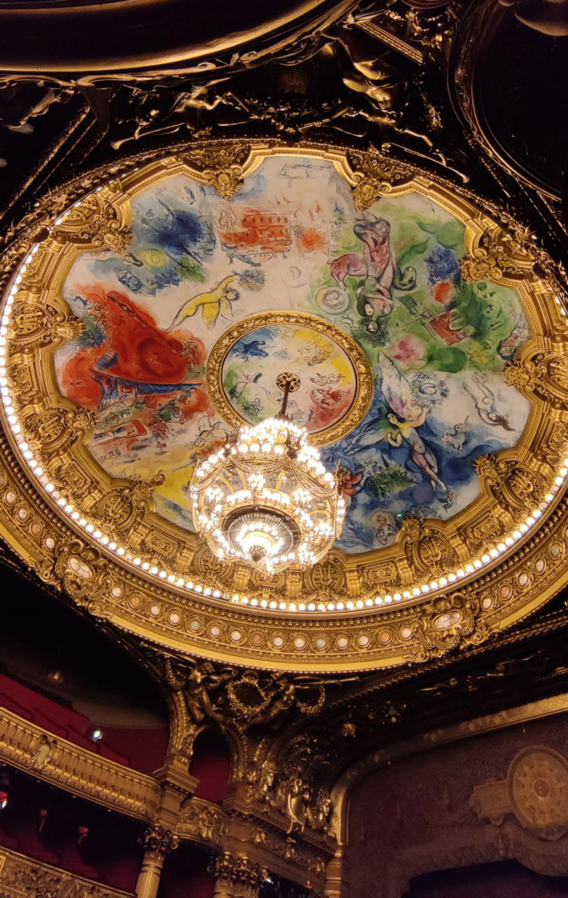 Le plafond de Chagall remplace depuis 1964 celui de Lenepveu, sali jadis par la fumée des 350 becs de gaz du lustre. On y voit 14 scènes des divers opéras. Il fallut à Chagall 4 ans de travail. Il ne se fit pas payer, il voulait témoigner sa gratitude à la France qui l’avait accueilli.