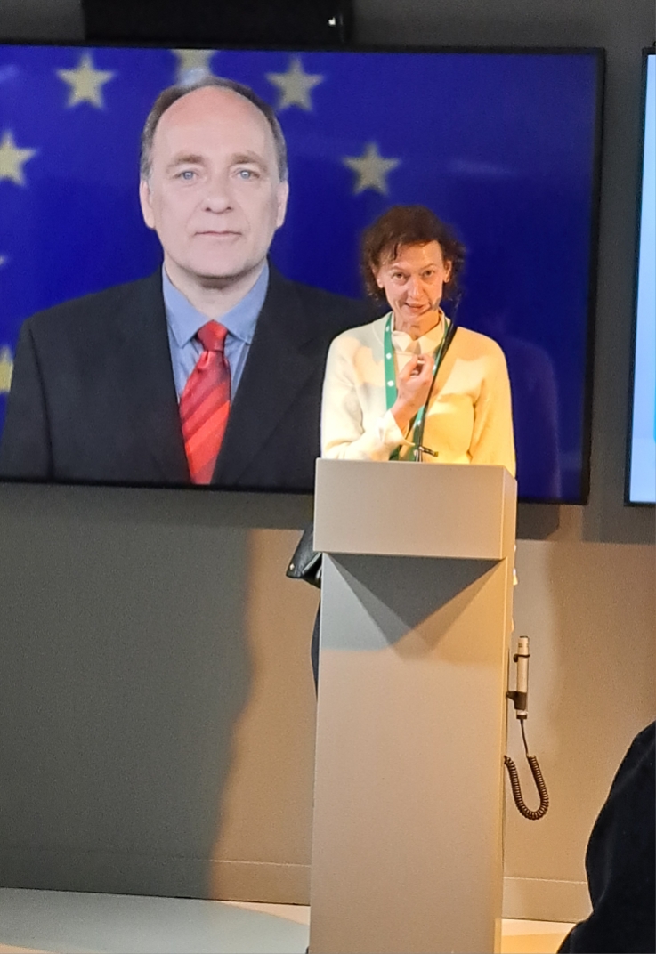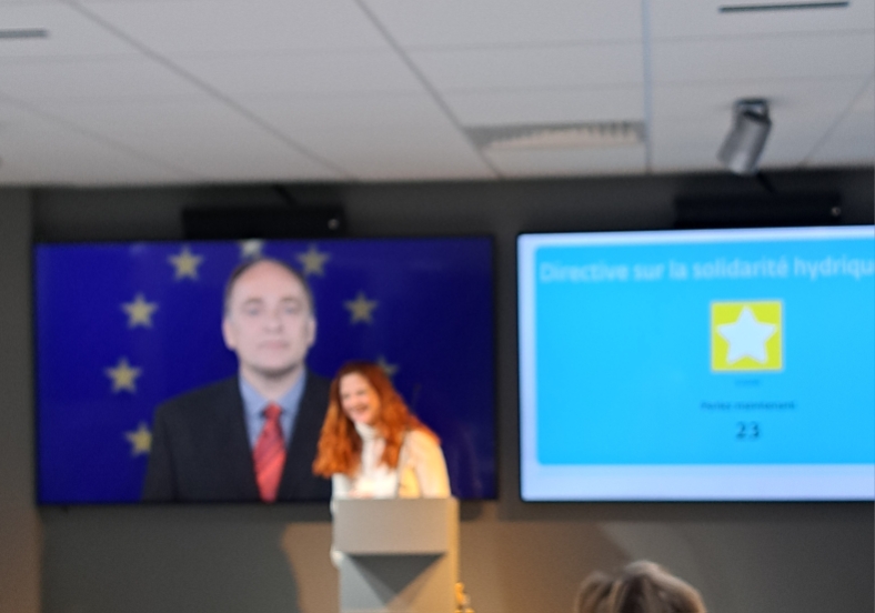On nous amène dans la salle n° 2 censée représenter l’hémicycle du Parlement de Strasbourg. Les sièges arborent les couleurs des groupes politiques. Un intervenant sur écran - le Président du Parlement européen - nous salue :