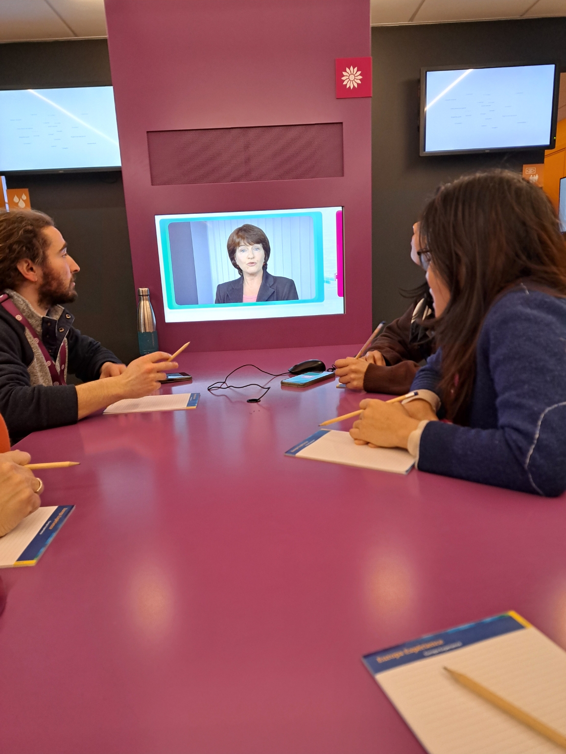 L’écran face à notre table est connecté à des emails, des coups de téléphone d’eurodéputés étrangers (les lobbyistes !), qui veulent nous convaincre... Sans compter les journalistes de la salle de Presse n°5 auxquels les étudiants doivent répondre au micro des pupitres.