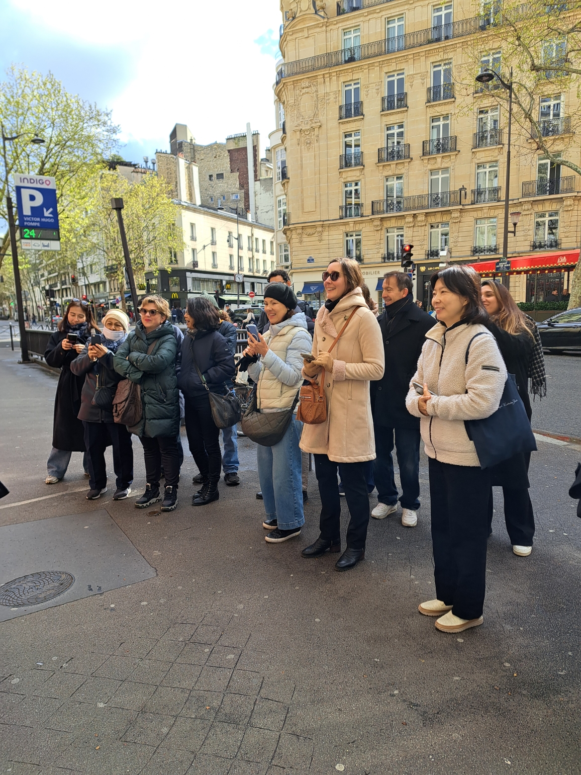 La place des Etats-Unis se profile dans son écrin de verdure. Jadis, l'Ambassade des USA occupait un des magnifiques hôtels particuliers qui jalonnent la place. Le groupe découvre le monument de La Fayette et Washington offert par les Américains à la France amie pour son aide pendant la Guerre d’Indépendance (1776).