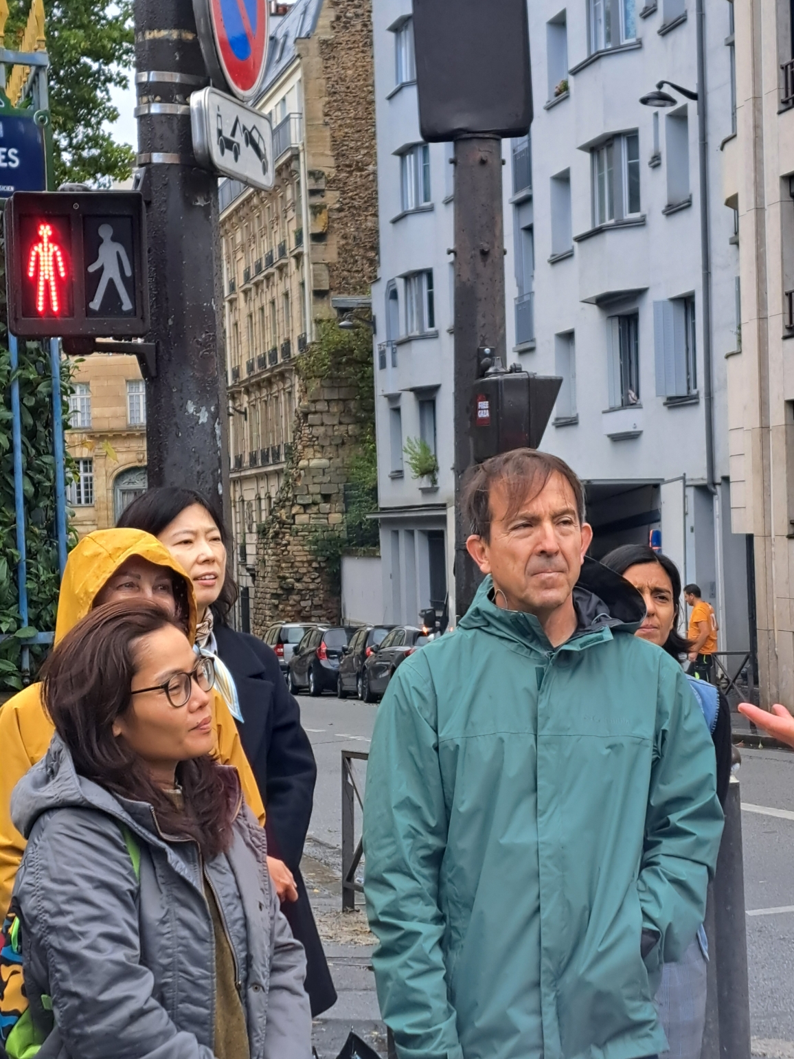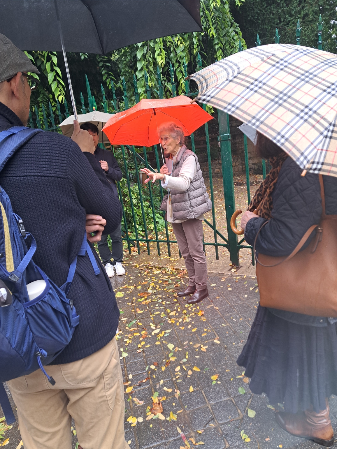 Une douzaine d'étudiants et trois animatrices se sont retrouvés sous une pluie battante au rendez-vous proche des Arènes de Lutèce. Mais la grille d'accès était fermée en raison du vent qui soufflait fort. L'exposé a donc eu lieu devant les arbres centenaires du jardin, chacun à l'abri sous son parapluie.