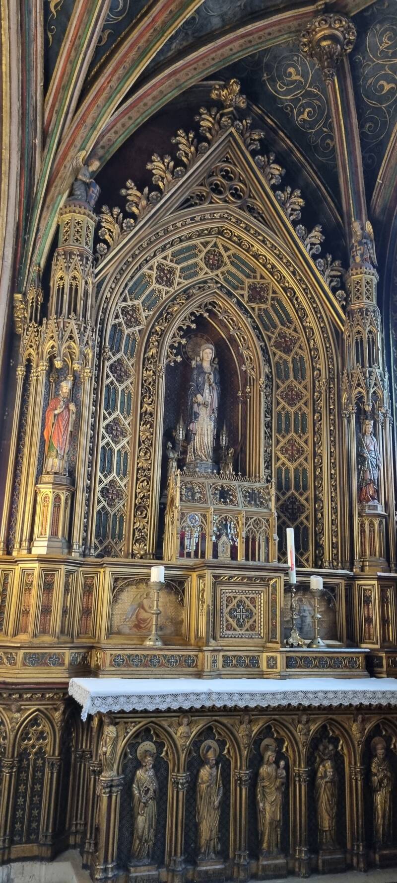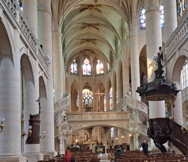 Montagne Sainte Geneviève : qui est cette femme étonnante dont la vie a laissé des traces profondes dans l’imaginaire parisien? Née dans une famille gallo-romaine attachée au service de Rome, elle est douée d’une grande intelligence, parle plusieurs langues, manifeste très tôt une forte personnalité. Devenue religieuse par choix, elle est appelée à éviter la prise de Paris par Attila, puis par les Francs. Considérée comme une sainte par le peuple dont elle prend soin, elle est vénérée après sa mort. Saint Etienne du Mont est l’église qui contient ce qui reste de ses reliques, dispersées par les révolutionnaires au 18e siècle. Cet acte destructeur n’empêche pas la dévotion populaire de continuer, et Geneviève est toujours la patronne chrétienne de Paris ! L’église, construite aux 16 et 17e siècles, garde la châsse de Geneviève. Elle abrite aussi un ornement architectural remarquable, son jubé de marbre, unique en France.