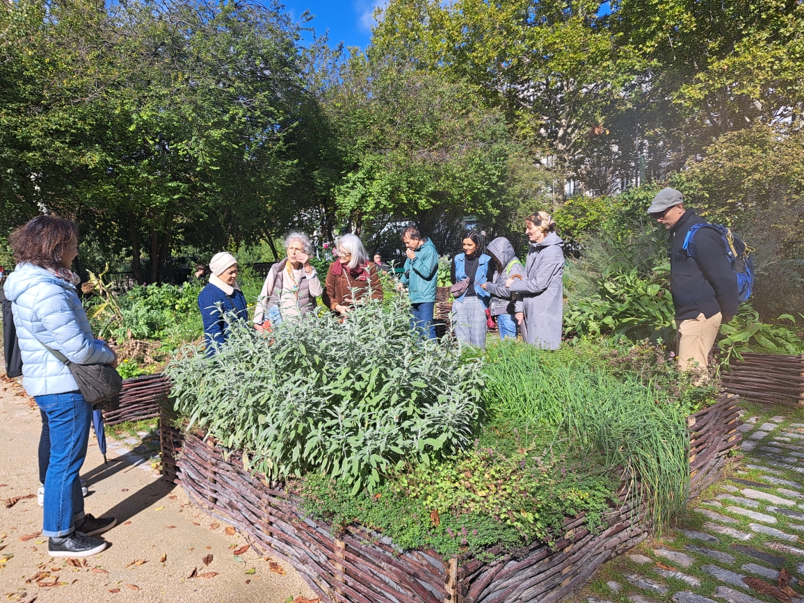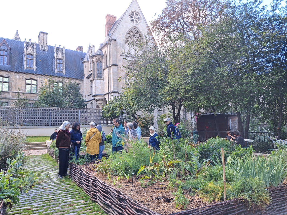 Notre épopée se termine dans le ravissant jardin qui le jouxte, baigné de soleil : ici, poussent les plantes aromatiques et médicinales tellement importantes au Moyen-Age: chacun de nous essaie de retrouver leurs noms, d’en décrire les vertus, de les respirer et même de…les goûter!