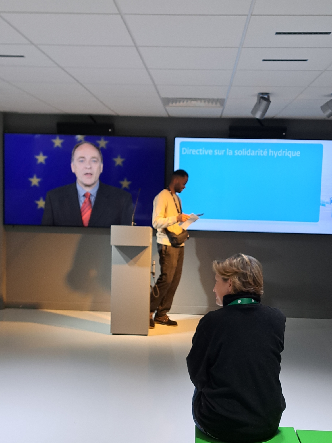 La presse internationale interviewe les eurodéputés porte-paroles de chaque groupe politique. Un projecteur éclaire chacun tour à tour pour qu’il réponde au micro du pupitre installé face à l’écran. Le reportage est retransmis dans la salle n° 3 des commissions.