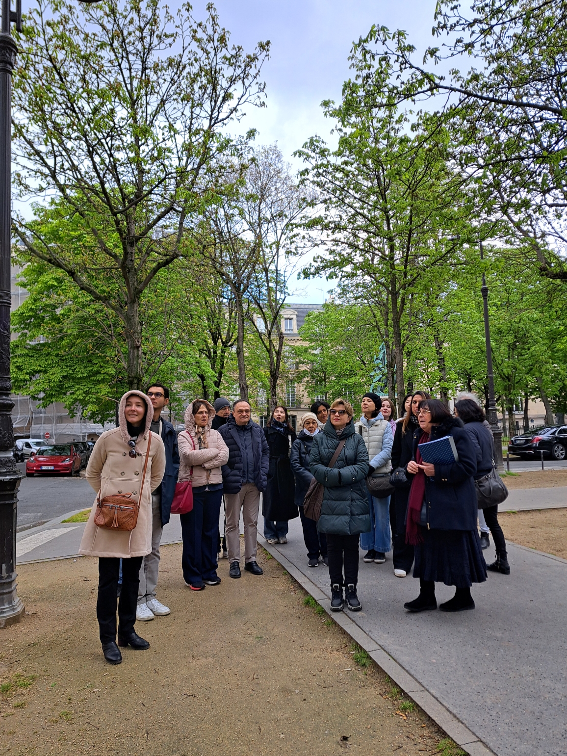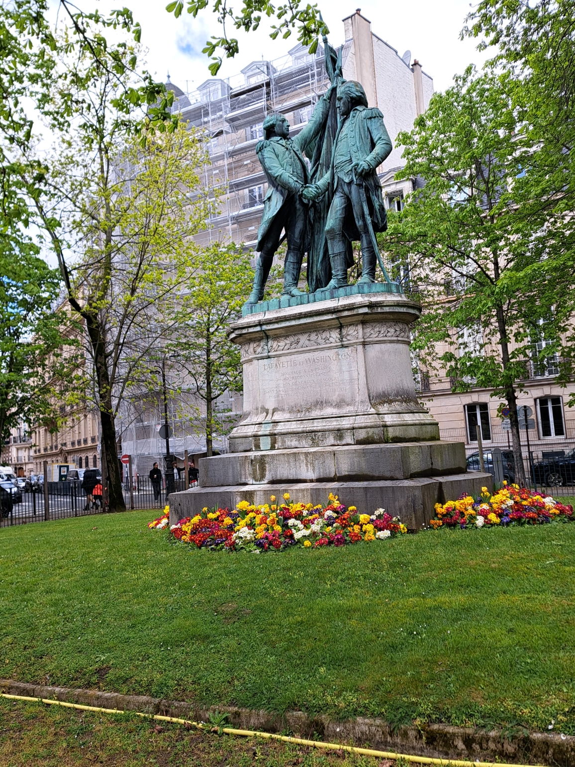 La place des Etats-Unis se profile dans son écrin de verdure. Jadis, l'Ambassade des USA occupait un des magnifiques hôtels particuliers qui jalonnent la place. Le groupe découvre le monument de La Fayette et Washington offert par les Américains à la France amie pour son aide pendant la Guerre d’Indépendance (1776).