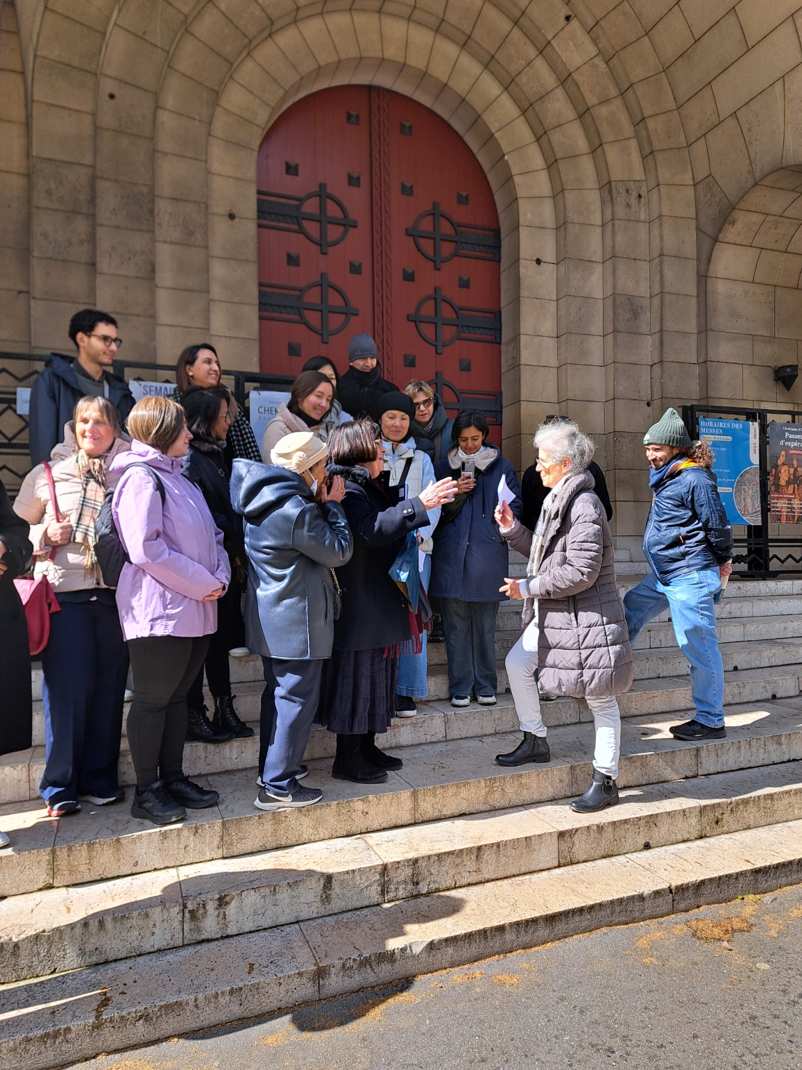 C’est devant cette église que - au nom du groupe et de l’ARC - Catherine remet à la guide Marie-Claire Vallet un message d’amitié et de remerciements accompagné d’un petit livre symbolique.